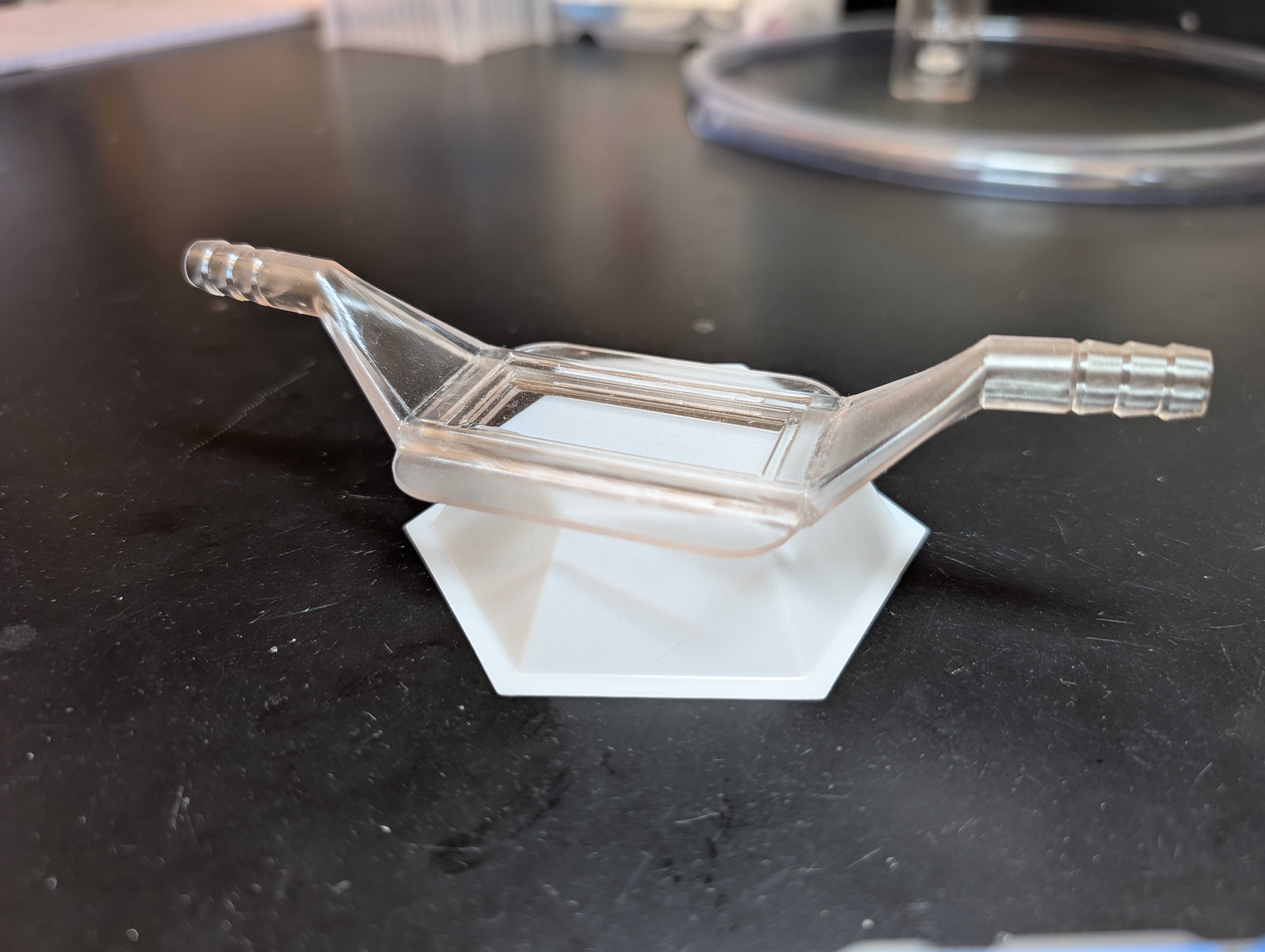 To achieve these, the system involves a reference thermistor, sitting out of the way of the worm, as well as a pump, which transports a specifically chosen heat transfer fluid across the cooling device. That device has been optimized to prioritize even cooling (i.e. that the inflow side and center are not significantly colder than the outflow and edges, as tends to happen). The coolant, motor, and device geometry have each gone through many iterations; even the materials of the slide have been optimized, using sapphire for its superior thermal conductivity over glass.